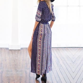 Bohemian Style Half Sleeve V-neck Slit Hem Printed Maxi Dress
