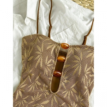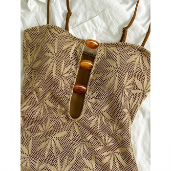 Bohemian Textured Leaf One-Piece Swimsuit with Resin Stone Cutout