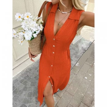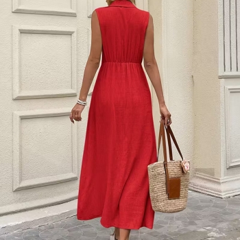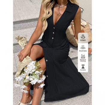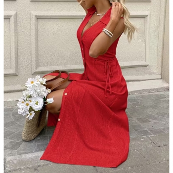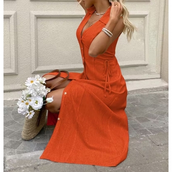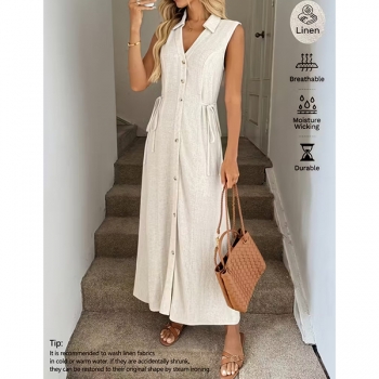 Boho-chic Lapel Collar V-neck Front Button Sleeveless Side Drawstring Dress