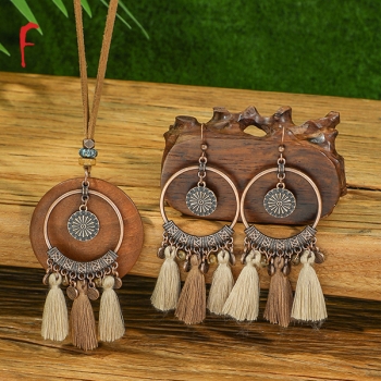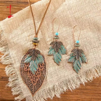 Boho-chic Tassel/Leaf Pendant Jewelry Set incl Neckline and Drop Earrings