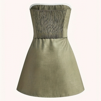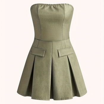 Cargo Style Strapless Mini Dress - Pleated Utility Tube Dress with Flap Pockets