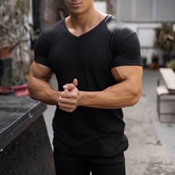 Casual Solid Color V-neck Short Sleeve Ribbed Shirt for Men
