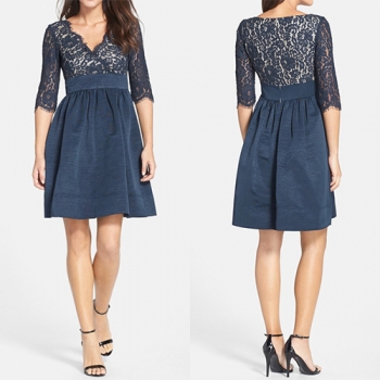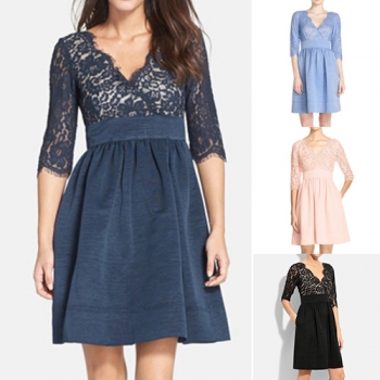 Elegant Lace Spliced Hollow Out Deep V-neck Half Sleeve Gathered Waist Dress