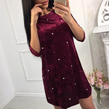 Elegant Solid Color Half Sleeve Round Neck Pearl Inlaid Dress