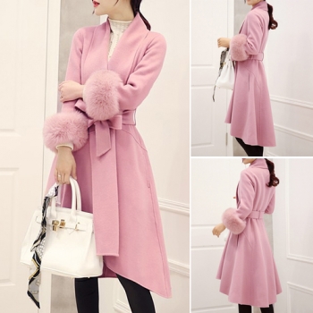 Elegant Solid Color Long Sleeve High-low Hemline Woolen Coat with Waist Strap