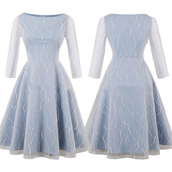 Elegant Solid Color Long Sleeve Round Neck Lace Spliced Dress