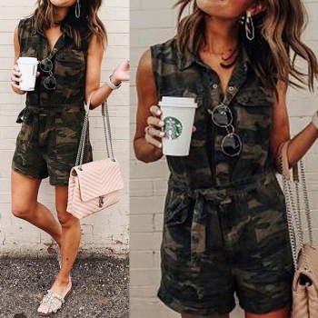 Fashion Camouflage Printed Sleeveless POLO Collar Romper