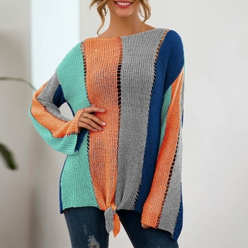 Fashion Contrast Color Long Sleeve Knotted Hem Knit Top