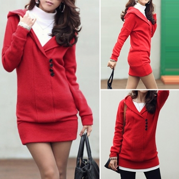 Fashion Dropped V-Neck Button Hooded Long-Sleeved Knit Top