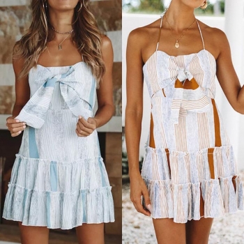 Fashion Halter Sleeveless Striped Bowknot Ruffle Hemline Dress