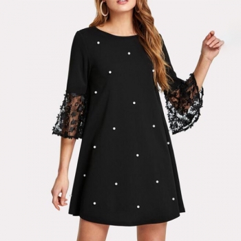 Fashion Lace Spliced half Sleeve Round Neck Loose Beaded Dress