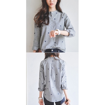 Fashion Leaves Embroidered Single-breasted Long Sleeve Stand Collar Striped Blouse