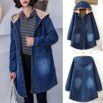 Fashion Long Sleeve Plush Lining Hooded Denim Coat