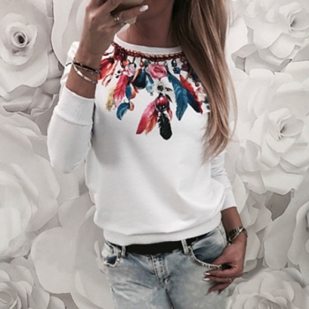 Fashion Long Sleeve Round Neck Feather Printed Sweatshirt