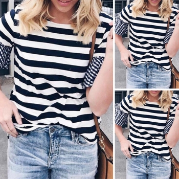 Fashion Plaid Spliced Trumpet Sleeve Round Neck Striped T-shirt