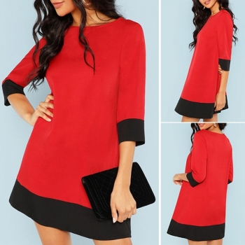 Fashion Round Neck 3/4 Sleeve Slim Fit Contrast Color A-line Dress