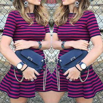 Fashion Short Sleeve Round Neck Flouncing Hem Striped Dress