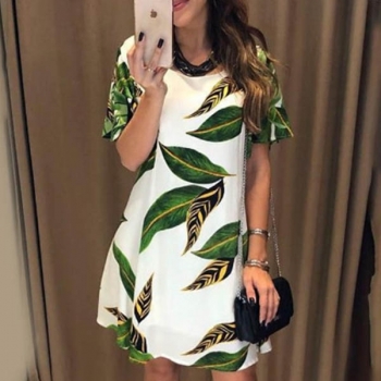 Fashion Short Sleeve Round Neck Leaf Printed Dress