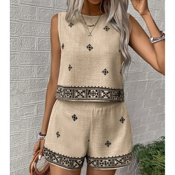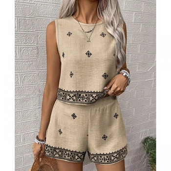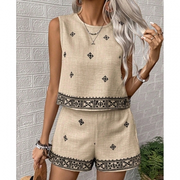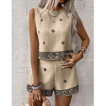 Fashion Short Sleeve Round Neck Tops + High Waist Shorts Printed Two-piece Set