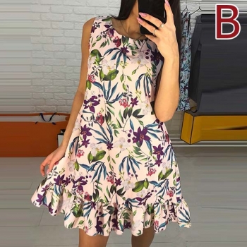 Fashion Sleeveless Round Neck Ruffle Hem Printed Dress