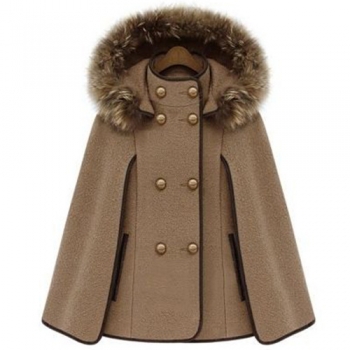 Fashion Solid Color Double-breasted Hooded Cape-style Woolen Coat