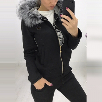 Fashion Solid Color Faux Fur Spliced Hooded Sweatshirt Coat + Pants Sports Suit
