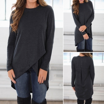 Fashion Solid Color Long Sleeve Round Neck Irregular Hem T-shirt
