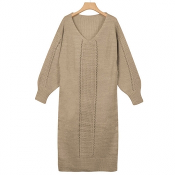 Fashion Solid Color Long Sleeve V-neck Hollow Out Sweater Dress