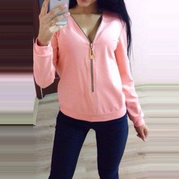 Fashion Solid Color Long Sleeve Zipper V-neck T-shirt