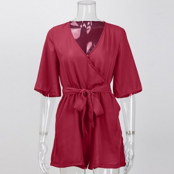 Fashion Solid Color Short Sleeve V-neck Chiffon Romper