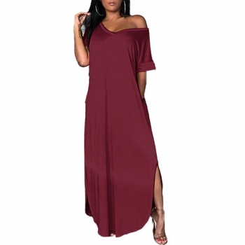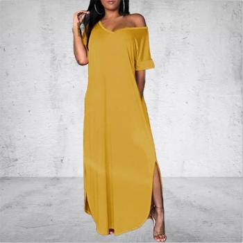 Fashion Solid Color Short Sleeve V-neck Slit Hem Maxi Dress