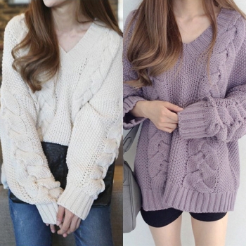 Fashion Solid Color V-neck Long Sleeve Loose-fitting Knit Sweater