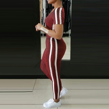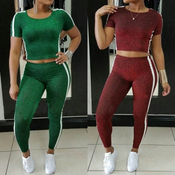 Fashion Striped Spliced Short Sleeve Top + Stretch Leggings Sports Suit