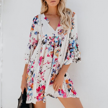 Fashion V-neck 3/4 Trumpet Sleeve Printed Loose Dress