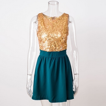 Nobby Gold Sequin Round Neck Sleeveless Gathered Waist Dress