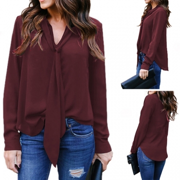 OL Style Long Sleeve Lace-up V-neck Solid Color Chiffon Blouse