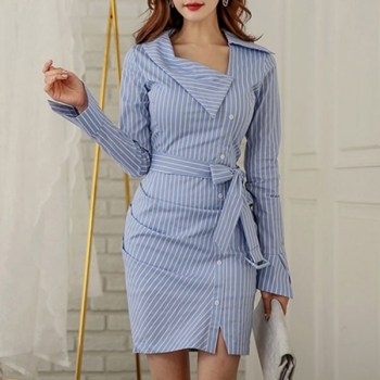 OL Style Long Sleeve Oblique Collar Slim Fit Striped Dress