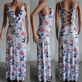 Sexy Backless Deep V-neck Slit Hem Printed Sling Dress