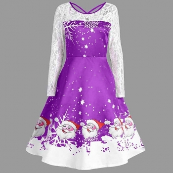 Sexy Backless Lace Spliced Long Sleeve Printed Christmas Dress