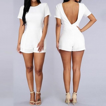 Sexy Backless Short Sleeve Round Neck Solid Color Rompers
