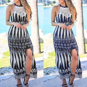 Sexy Backless Slit Hem High Waist Printed Halter Dress