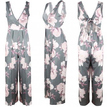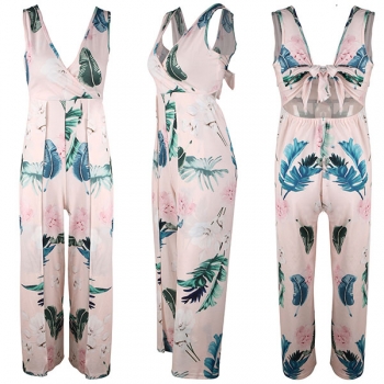 Sexy Backless V-neck Slit Hem Sleeveless Printed Jumpsuit