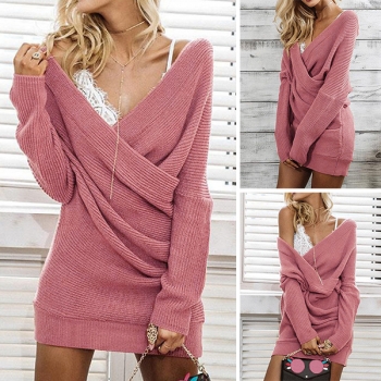 Sexy Crossover Deep V-neck Long Sleeve Solid Color Sweater Dress
