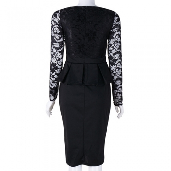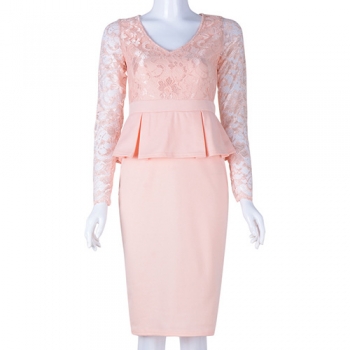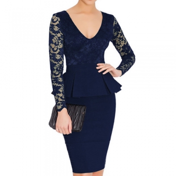 Sexy Deep V-neck Lace Spliced Long Sleeve Pencil Dress