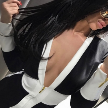 Sexy Deep V-neck Long Sleeve Contrast Color Slim Fit Dress