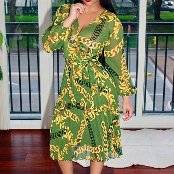 Sexy Deep V-neck Long Sleeve Printed Chiffon Dress