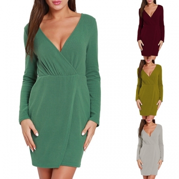 Sexy Deep V-neck Long Sleeve Solid Color Knit Dress