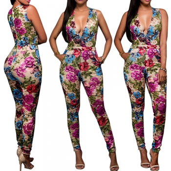 Sexy Deep V-neck Sleeveless Printed High Waist Jumpsuit