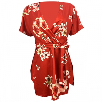 Sexy Deep V-neck Slit Hem Short Sleeve Printed Dress