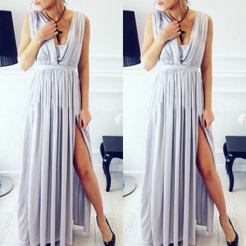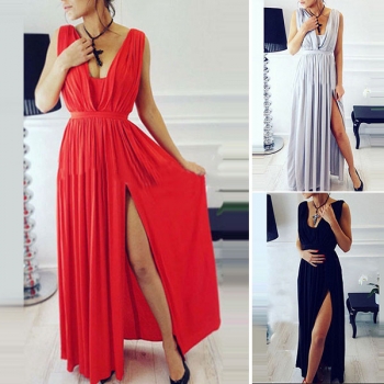 Sexy Deep V-neck Slit Hem Sleeveless High Waist Party Dress